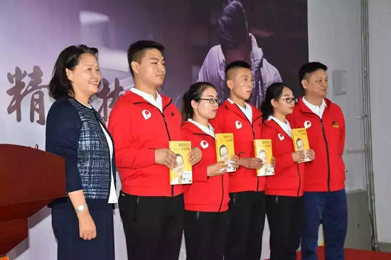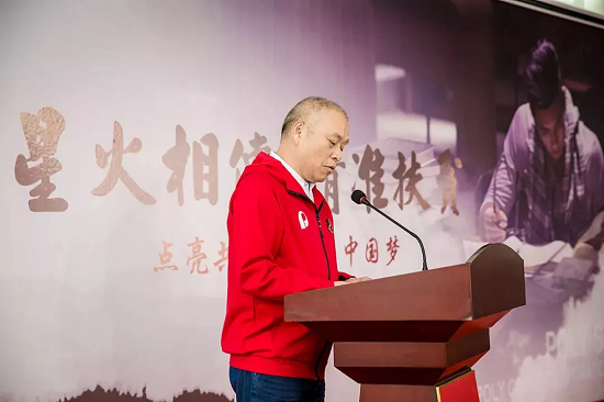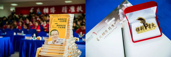 付俊、徐碚向学生代表赠予书籍,卜玉龙向学生代表授予“保利星火班”旗帜。