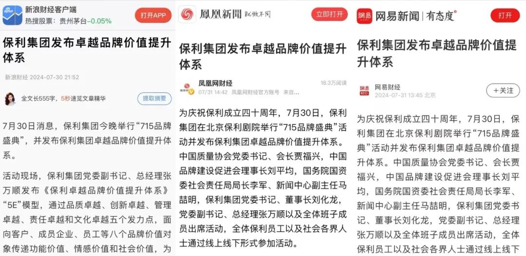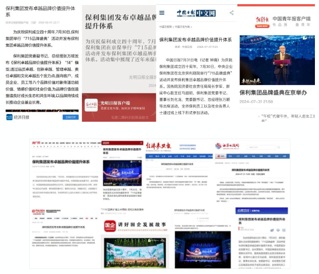 聚焦品牌盛典活动盛况。人民日报发布整版版面《有为跨山海 卓越向未来》,凸显保利坚守初心、服务家国的企业标识;人民网进行焦点图轮播并发起“7·15品牌盛典”云直播。此外,光明日报、经济日报、中国日报、中国青年报等数十家权威主流媒体和凤凰新闻、网易新闻、新浪财经各类行业媒体累计曝光数据近3000万,充分肯定了保利胸怀“国之大者”,带动行业发展的引领性、示范性。