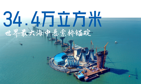 为确保工程质量,保利长大自主研发关键技术,打造世界最大海中悬索桥锚碇,单个锚碇混凝土方量约34.4万立方米,重量高达100万吨,在海中立下“定海神针”。
